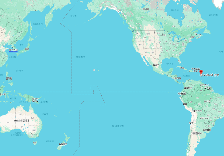 대한민국 기준으로 "도미니카연방"까지의 거리는 약 14,219km이며 시차는 도미니카연방이 13시간 느립니다.