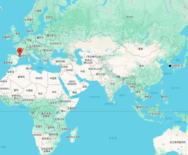 대한민국 기준으로 "안도라"까지의 거리는 약 9,726km, 시차는 안도라가 7시간 느립니다.