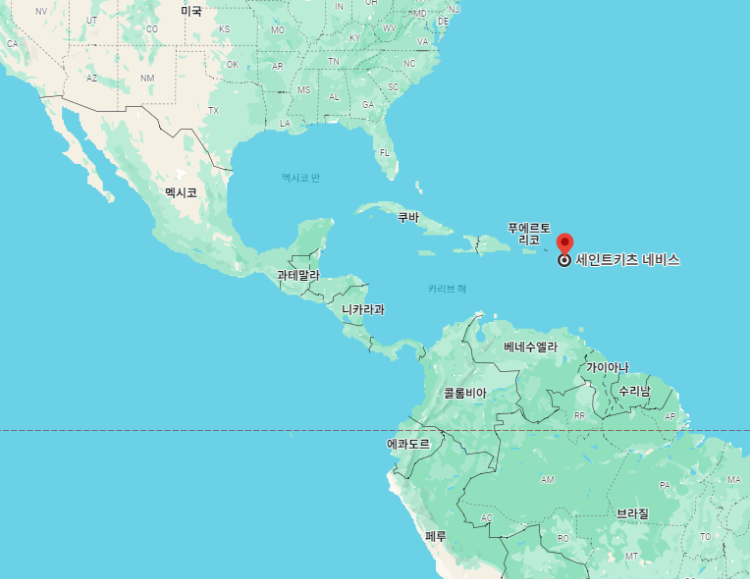 "세인트키츠네비스"는 중앙아메리카 카리브해에 위치하고 있는 작은 섬나라로 공식 국명은 세인트키츠네비스연방"Federation of St. Kitts and Nevis"입니다.