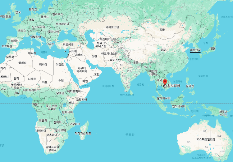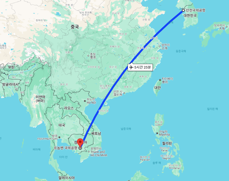 대한민국 기준으로 캄보디아 수도 "프놈펜"까지의 거리는 약 3,547km, 비행시간은 최소 5시간 25분, 시차는 캄보디아가 2시간 느립니다.