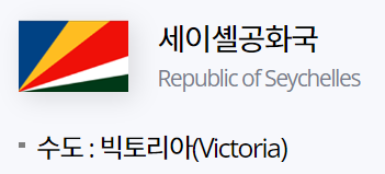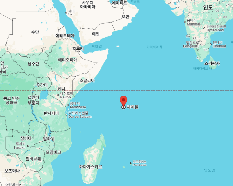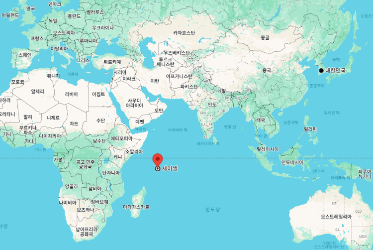 대한민국 기준으로 "세이셸"까지의 거리는 약 8,733km, 시차는 세이셸이 5시간 느립니다.