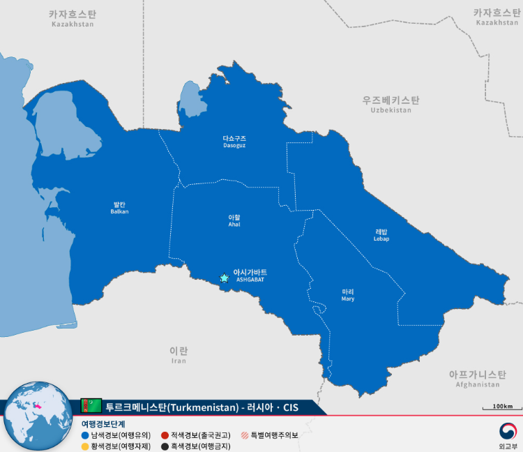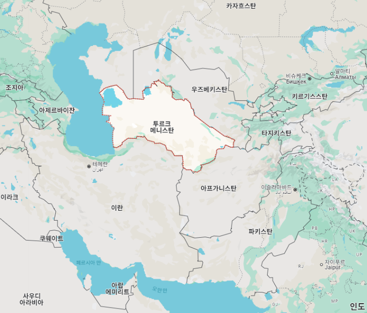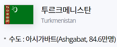 투르크메니스탄"Turkmenistan"은 중앙아시아 서남부 "카스피해"에 면한 국가로, 수도는 아시가바트"Ashgabat"입니다.