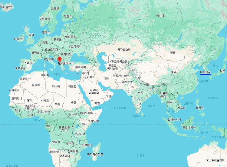 대한민국 기준으로 알바니아 수도 "티라나"까지의 거리는 8,720km, 시차는 알바니아가 7시간 느립니다.