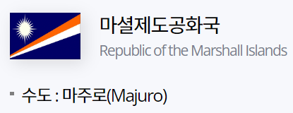 마셜 제도"Marshall Islands"는 오세아니아 태평양 중서부에 작은 섬으로 구성되어 있는 도서국가로, 수도는 마주로"Majuro"입니다.