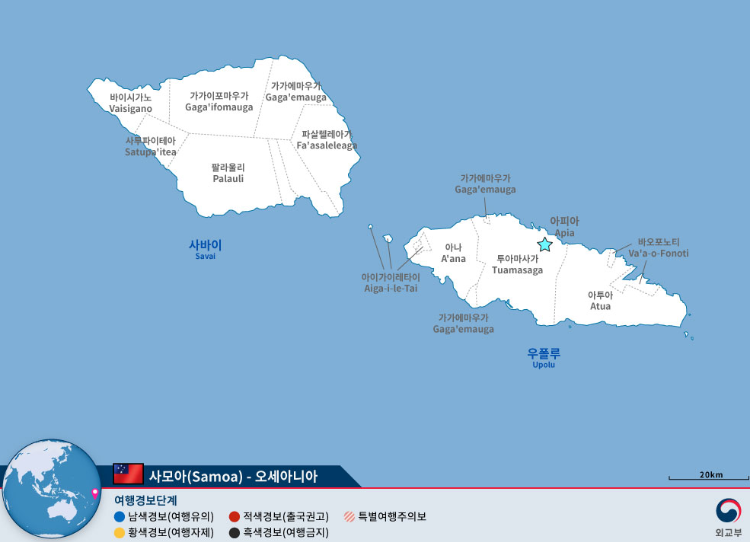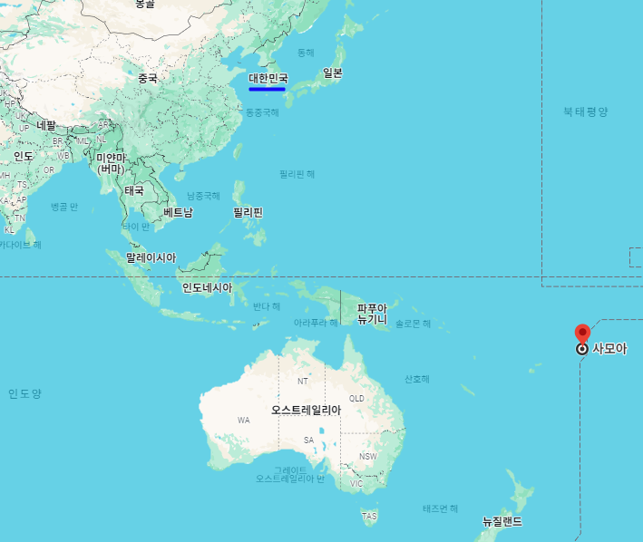 대한민국 기준으로 사모아 수도 "아피아"까지의 거리는 약 8,409km, 시차는 사모아가 4시간 빠릅니다.