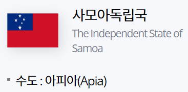 "사모아"는 오세아니아 남태평양에 섬으로 구성된 입헌군주국으로, 공식 국명은 사모아독립국"The Independent State of Samoa"입니다.