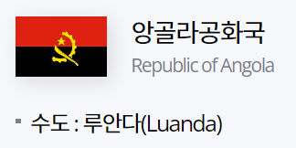 "앙골라"는 아프리카 남서부 대서양 연안에 위치하고 있는 국가로, 공식 국명은 앙골라공화국"Republic of Angola"입니다.