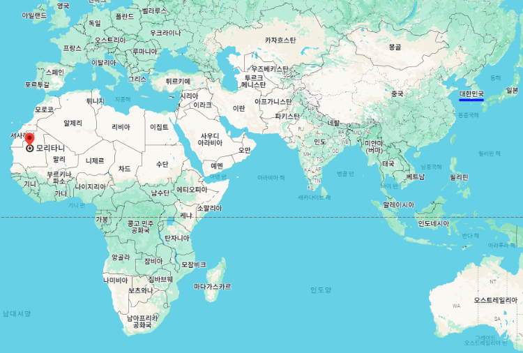 대한민국 기준으로 모리타니 수도 "누악쇼트"까지의 거리는 약 12,894km이며, 시차는 모리타니가 9시간 느립니다.