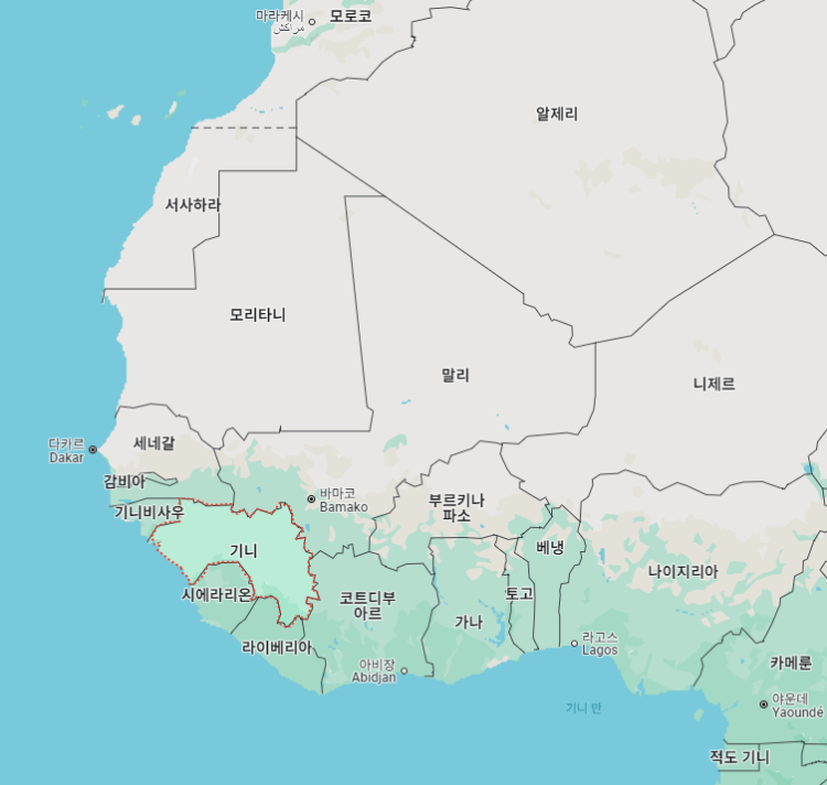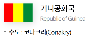 "기니"는 아프리카 북서부 대서양 연안에 위치하고 있는 국가로, 공식 국명은 기니공화국"Republic of Guinea"입니다. *"적도기니"와는 다른 국가다.