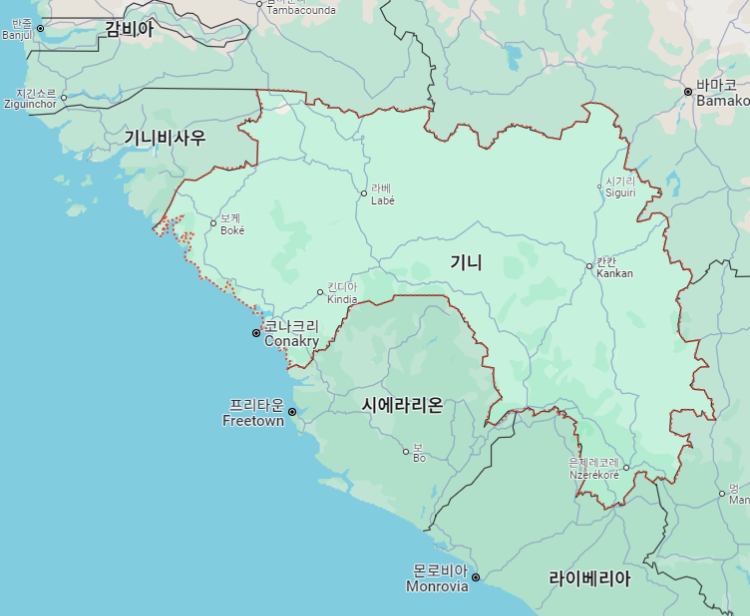 기니 면적은 약 24만 6000㎢(한반도의 1.1배)으로 세계 78위, 인구는 약 1452만 명으로 세계 115위, 수도는 코나크리"Conakry"입니다.