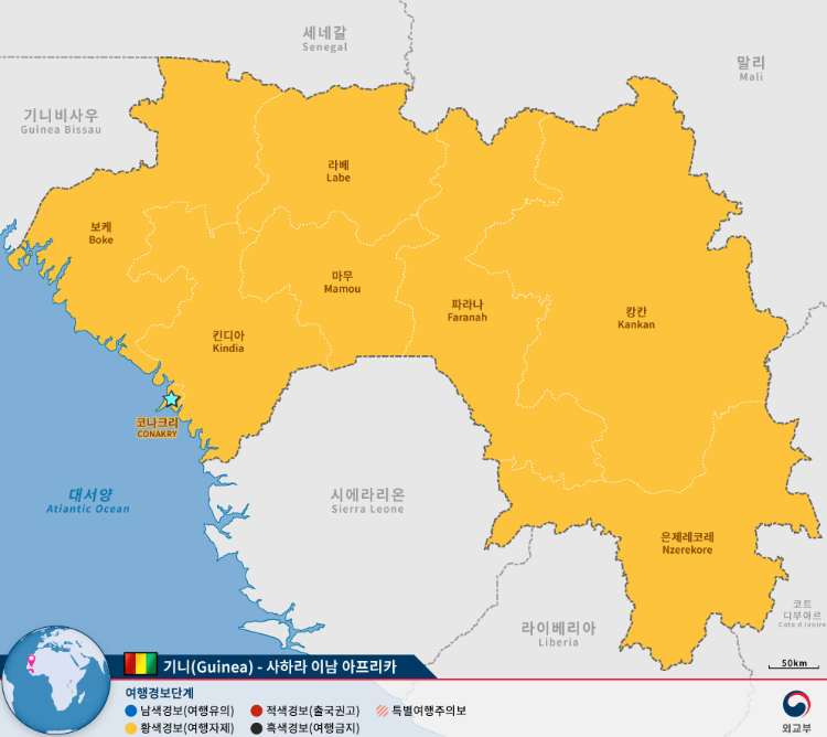 대한민국과 기니는 2006년 외교관계를 수립했는데 현지 대사관은 없고 세네갈한국대사관이 겸임하고 있습니다.