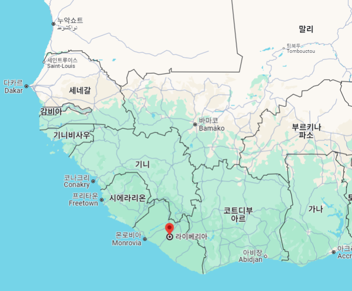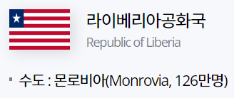 "라이베리아" 아프리카 중서부 대서양 연안에 위치하고 있는 국가로, 공식 국명은 라이베리아공화국"Republic of Liberia"입니다.