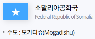 "소말리아"는 아프리카 대륙의 북동부에 위치하고 있는 국가로, 공식 국명은 소말리아공화국"Federal Republic of Somalia"입니다.