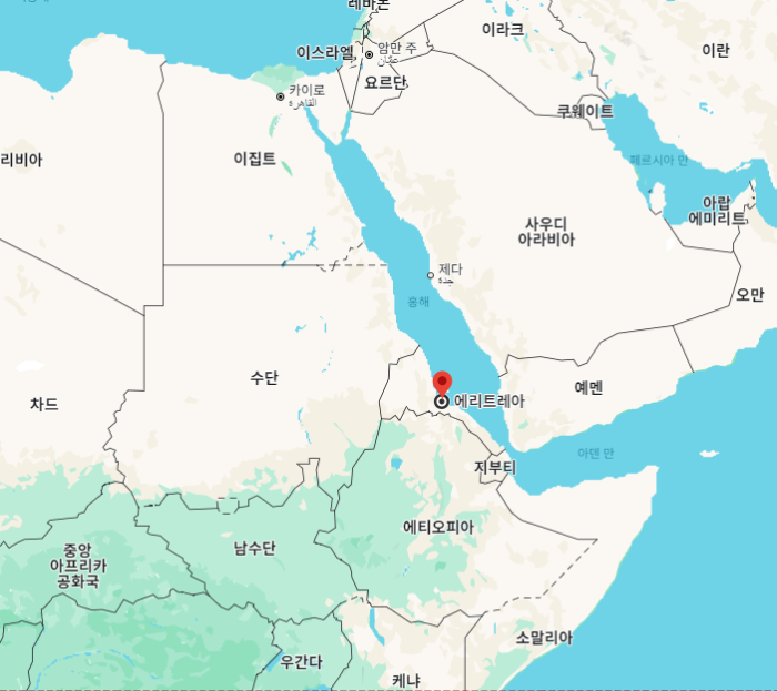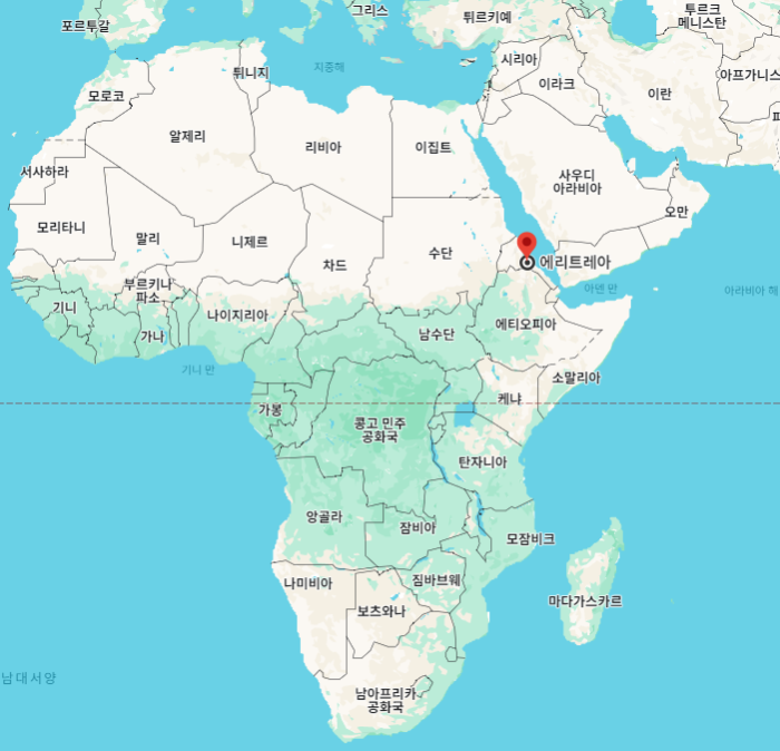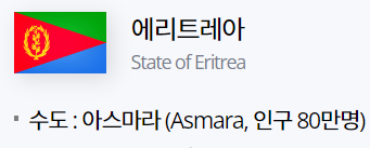 에리트레아"Eritrea"는 아프리카 북동부 홍해 연안에 위치하고 있는 국가로, 수도는 아스마라"Asmara"입니다.
