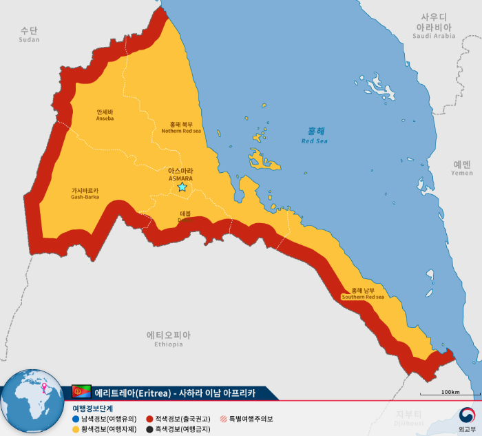 대한민국과 에리트레아는 1993년 외교관계를 수립했는데 현지 대사관은 없고 수단한국대사관이 겸임하고 있습니다. 영사콜센터(24시간): +82-2-3210-0404