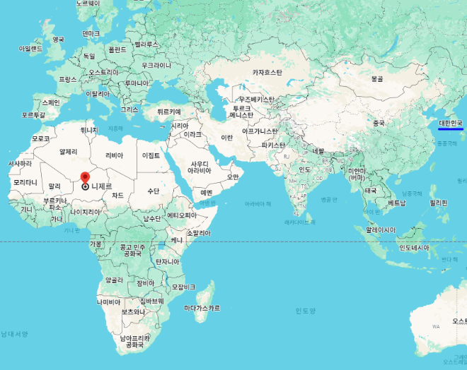 대한민국 기준으로 니제르 수도 "니아메"까지의 거리는 약 12,088km이며, 시차는 니제르가 8시간 느립니다.