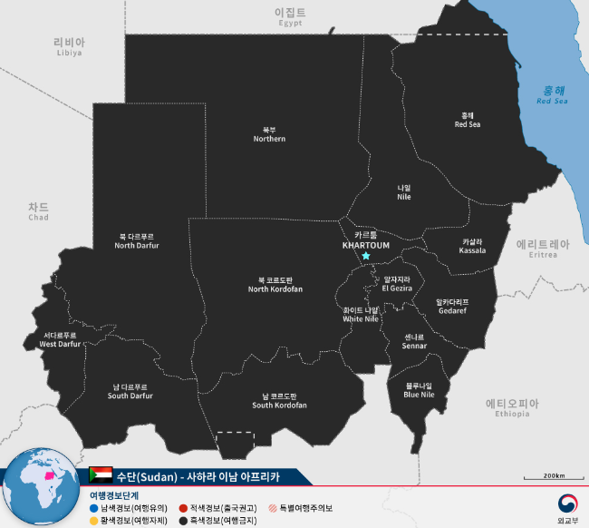 한편 현재 수단 전 지역은 대한민국외교부에서 흑색경보(여행금지) 구역으로 지정되어 있습니다.