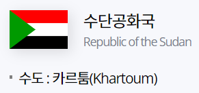 "수단"은 아프리카 대륙의 동북부에 위치하고 있는 국가로, 공식 국명은 수단공화국"Republic of the Sudan"입니다.