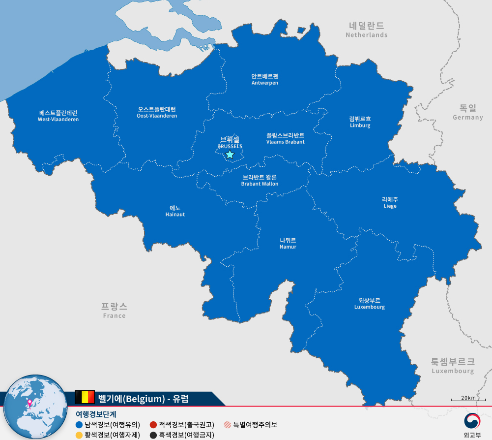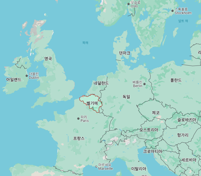 벨기에"Belgium"는 유럽 북서부에 위치한 국가로, 면적은 약 3만㎢(한반도의 0.14배), 수도는 브뤼셀"Brussels"입니다.