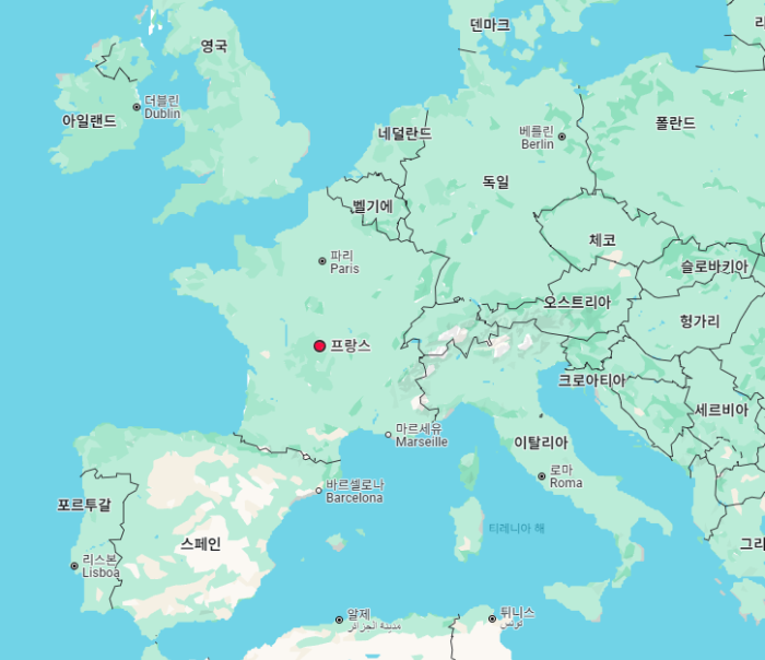 프랑스"France"는 대서양과 지중해 사이, 유럽 서부에 위치한 국가로, 수도는 파리"Paris"입니다.