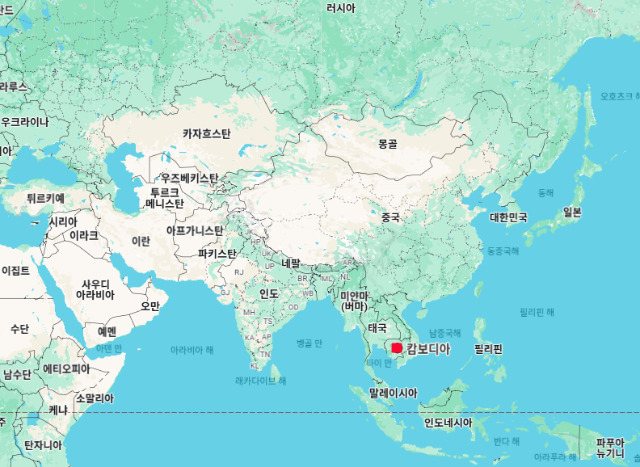 캄보디아'Cambodia'는 동남아시아 인도차이나반도 남서부에 있는 나라로, 수도는 프놈펜'Pnompen'입니다.