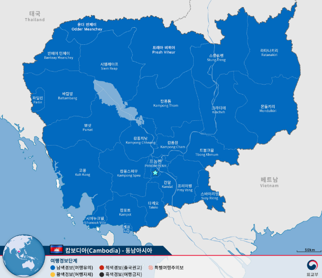 한편 대한민국 서울을 기준으로 '캄보디아'까지의 거리는 약 3,532km, 비행시간은 약 5시간 45분, 시차는 서울이 2시간 빠릅니다.