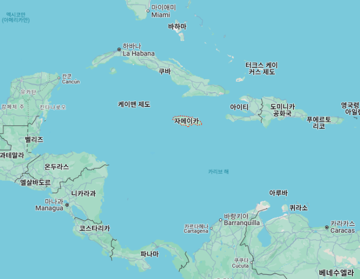 자메이카'Jamaica'는 카리브해 북부에 위치한 도서국가로, 면적 약 10,990㎢(세계 85위)으로 대한민국의 1/10 크기이며, 수도는 킹스턴'Kingston'입니다.