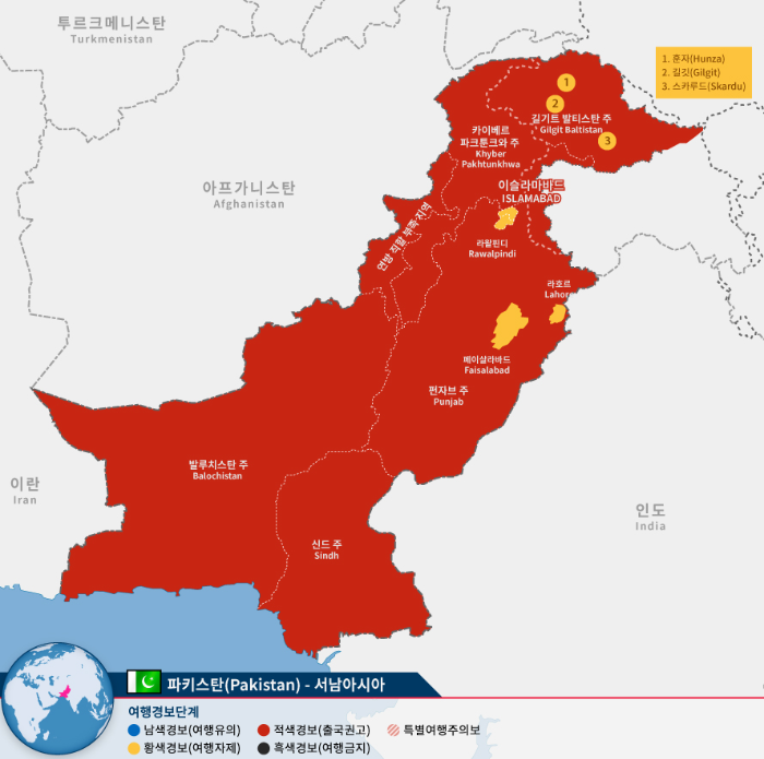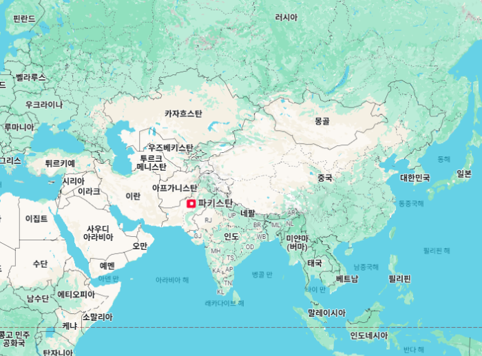파키스탄"Pakistan'은 서남아시아에 위치한 국가로, 면적 약 79만㎢(세계 35위)으로 한반도의 약 3.6배이며, 수도는 이슬라마바드'Islamabad'입니다.