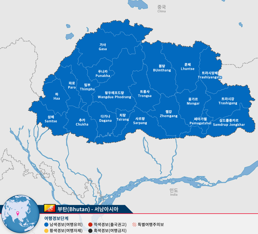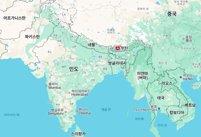 부탄'Bhutan'은 남부아시아에 위치한 국가로, 면적 약 384만 ha(세계 135위)으로 한반도의 약 0.18배, 수도는 팀부'Thimphu'입니다.