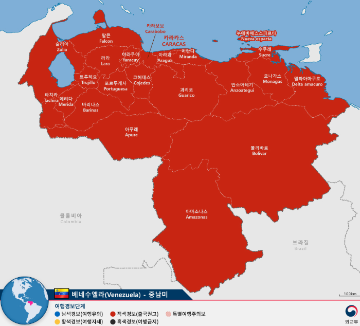 베네수엘라'Venezuela'는 남미 북부에 위치한 국가로 면적 약 9,120만 ha(세계 32위)로 대한민국의 약 10배 크기이며, 수도는 카라카스'Caracas'입니다.