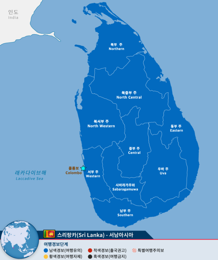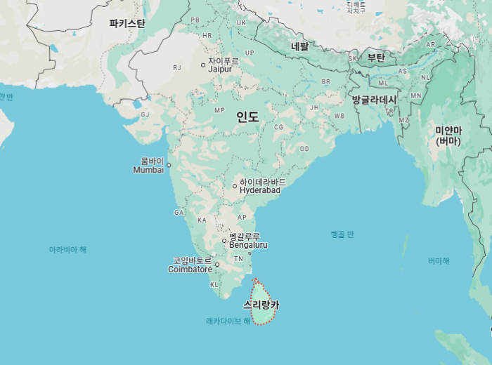 스리랑카'Sri Lanka'는 남아시아에 위치한 도서국가로, 면적 약 656만 ha(세계 124위)로 한반도의 1/3 크기이며, 수도는 콜롬보'Colombo'입니다.