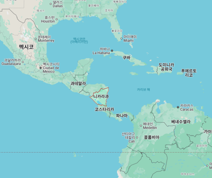 니카라과'Nicaragua'는 중앙 아메리카에 위치한 나라로, 면적 약 1,303만 ha(세계 98위)로 한반도의 0.6배, 수도는 마나과'Managua'입니다.