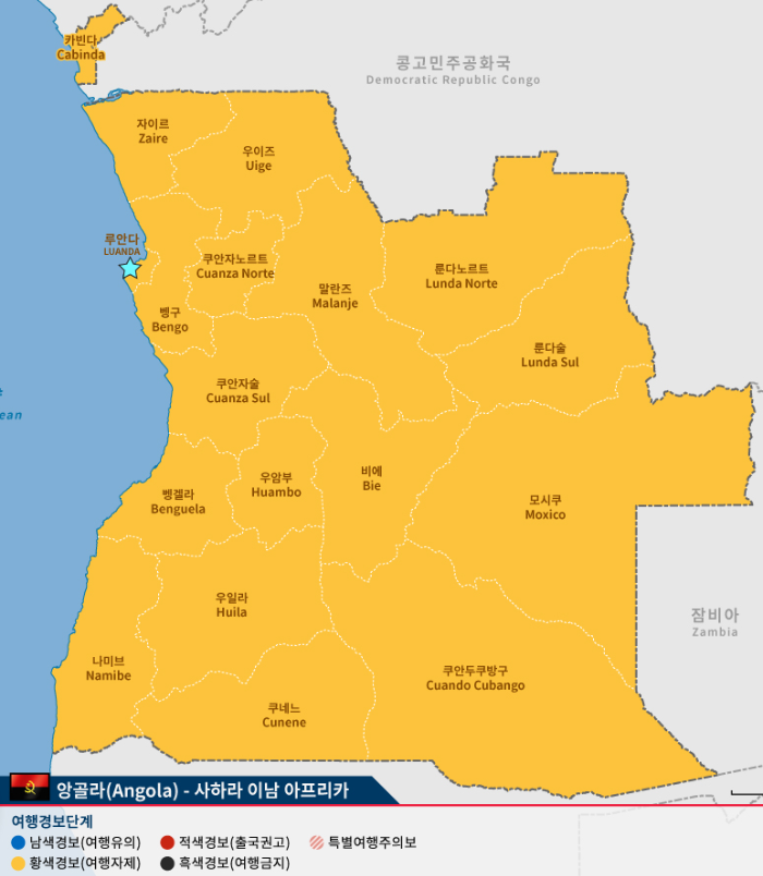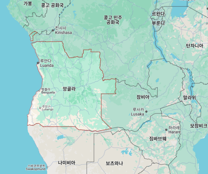 앙골라'Angola'는 아프리카 서남부 대서양 연안에 있는 공화국으로, 면적 약 1억 2,467만 ha(세계 22위)으로 대한민국의 약 12배 크기이며, 수도는 루안다'Luanda'입니다.