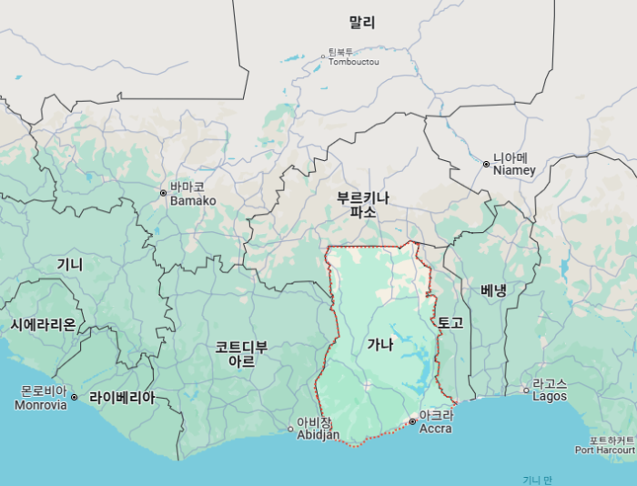 가나'Ghana'는 아프리카 서부에 위치한 나라로, 면적 약 2,385만 ha(세계 81위)로 한반도의 1.1배, 수도는 아크라'Accra'입니다.