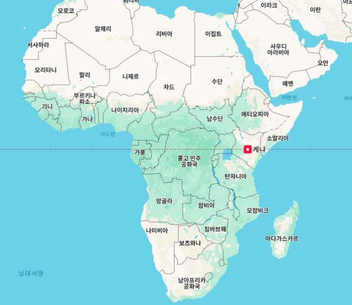 케냐'Kenya'는 아프리카 동부에 위치한 나라로, 면적 약 5,803만 ha(세계 47위)로 한반도의 2.6배, 수도는 나이로비'Nairobi'입니다.