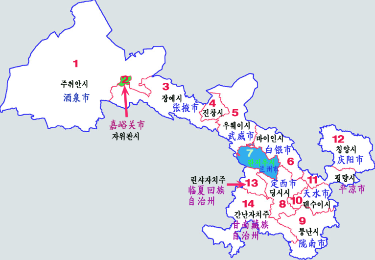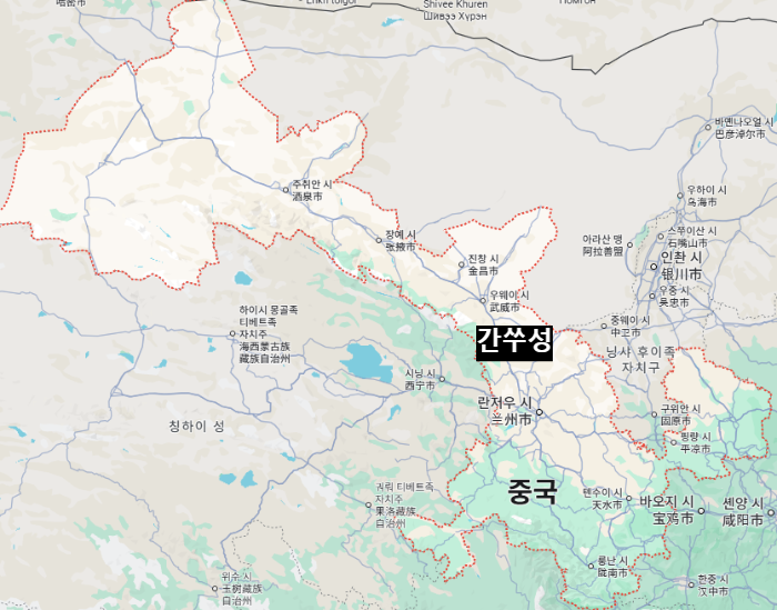 간쑤 성'Gansu Sheng'은 중국 성급 행정구 33개 중에 하나로 중국 서북부에 위치하고 있으며, 면적은 약 453,700㎢으로 한반도의 약 2배 크기입니다.