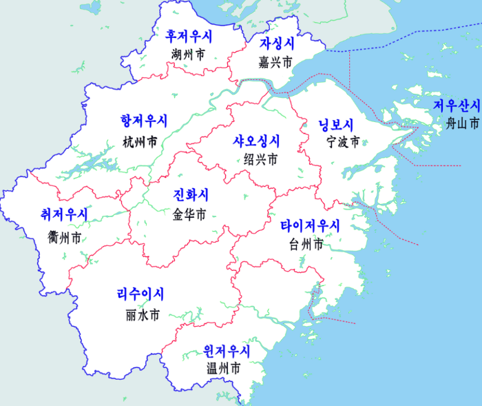저장성의 성도이자 최대도시는 '항저우시'이며 그 밖의 지급 행정구역은 닝보시, 후저우시, 자싱시, 진화시, 리수이시, 취저우시, 사오싱시, 타이저우시, 원저우시, 저우산시 등이 있습니다.