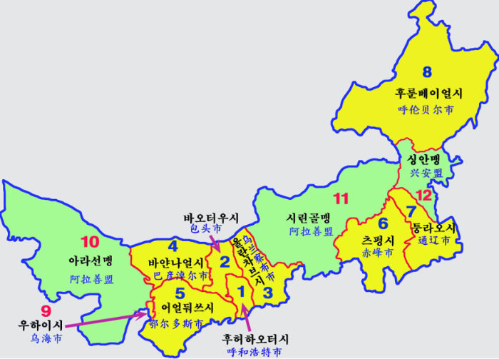 내몽골 자치구의 청사소재지는 '후허하오터시'이며, 그 밖의 지급시는 바오터우시, 우하이시, 츠펑시, 퉁랴오시, 어얼둬쓰시, 후룬베이얼시, 바예나오얼시, 우란차부시 등이 있습니다.