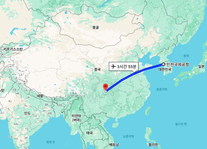 대한민국 서울에서 충칭시까지의 거리는 약 2천 km, 인천공항에서 충칭까지의 비행시간은 약 4시간 내외, 시차는 1시간 느립니다.