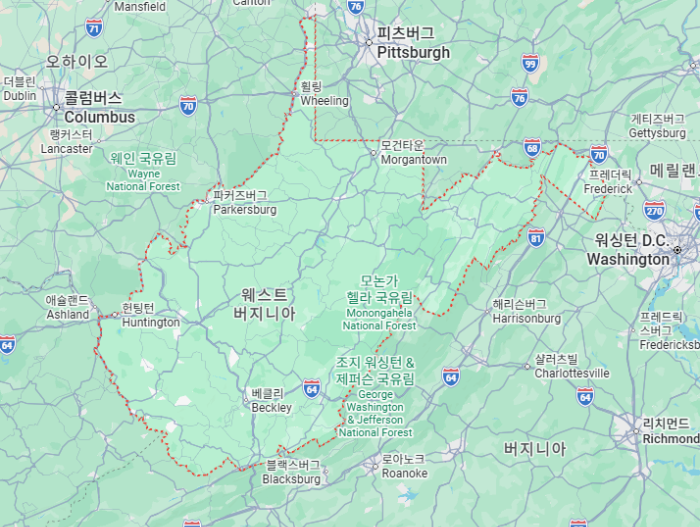 지금부터 미국 웨스트버지니아주 지도 위치와 명소 등을 간단히 살펴보겠습니다.
