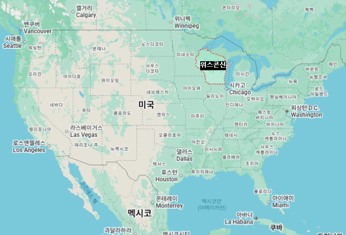 위스콘신주'Wisconsin(WI)'는 미국 중북부에 미시간호와 슈피리어호에 접해 있으며, 면적은 약 16.9만㎢, 인구는 약 596만 명입니다.